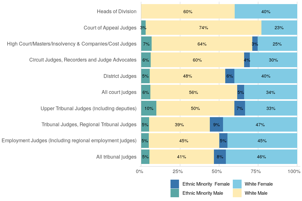 | The proportions of female and ethnic minority individuals were higher amongst the magistracy than in the judiciary. | Over half (57%) of all magistrates were female. Ethnic minorities made up 13%. |