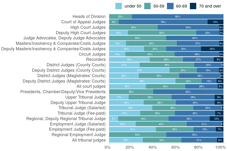 Magistrates tended to be older than judges on average, with 81% of those in post being 50 and over.
