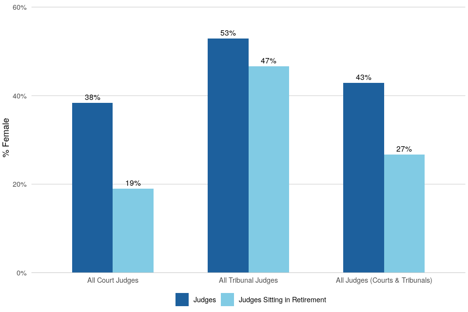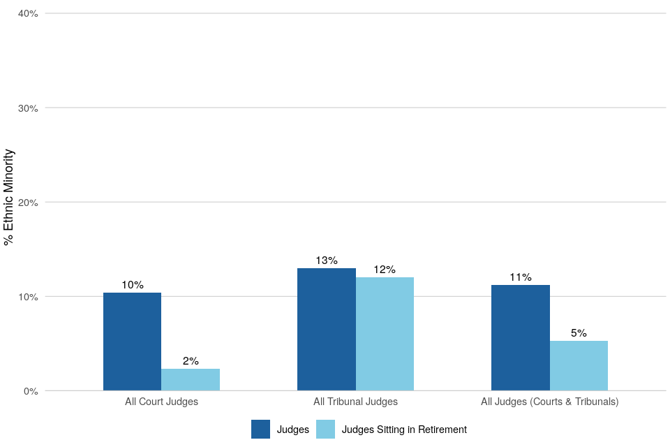 | In comparison to judges, a lower proportion of judges sitting in retirement are female or from an ethnic minority background, but a higher proportion have a non-barrister background. | Over a quarter (27%) of all judges sitting in retirement are female. Ethnic minorities made up about 5%. Non-barristers made up over half (55%) of judges sitting in retirement, compared to 40% for all current judges. |
