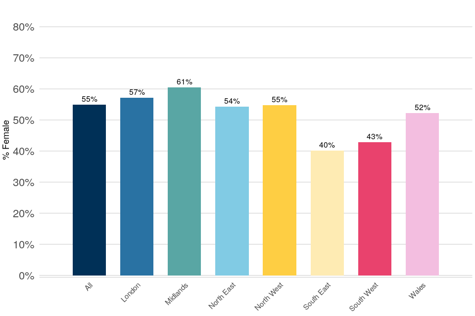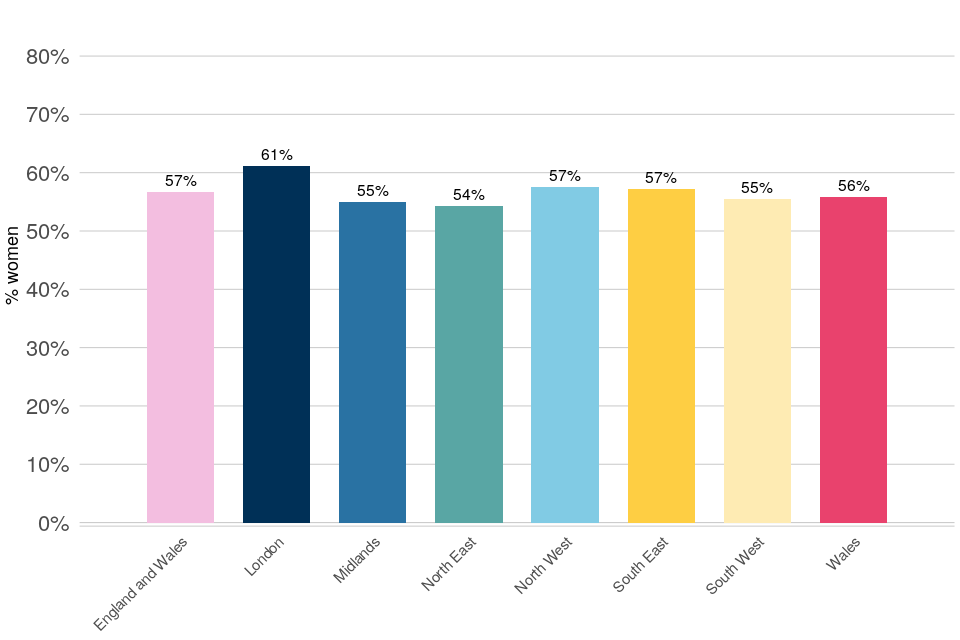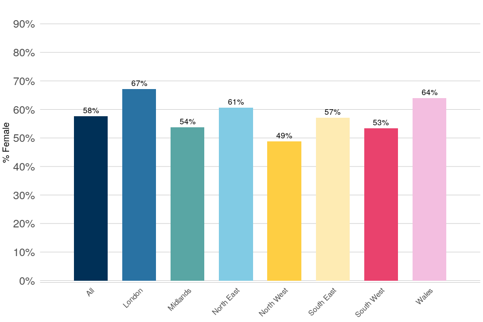 Female individuals represented 58% of all magistrate appointments made in 2023-24. The female proportion of appointments by region ranged from 49% in the North West to 67% in London (Figure 50).
