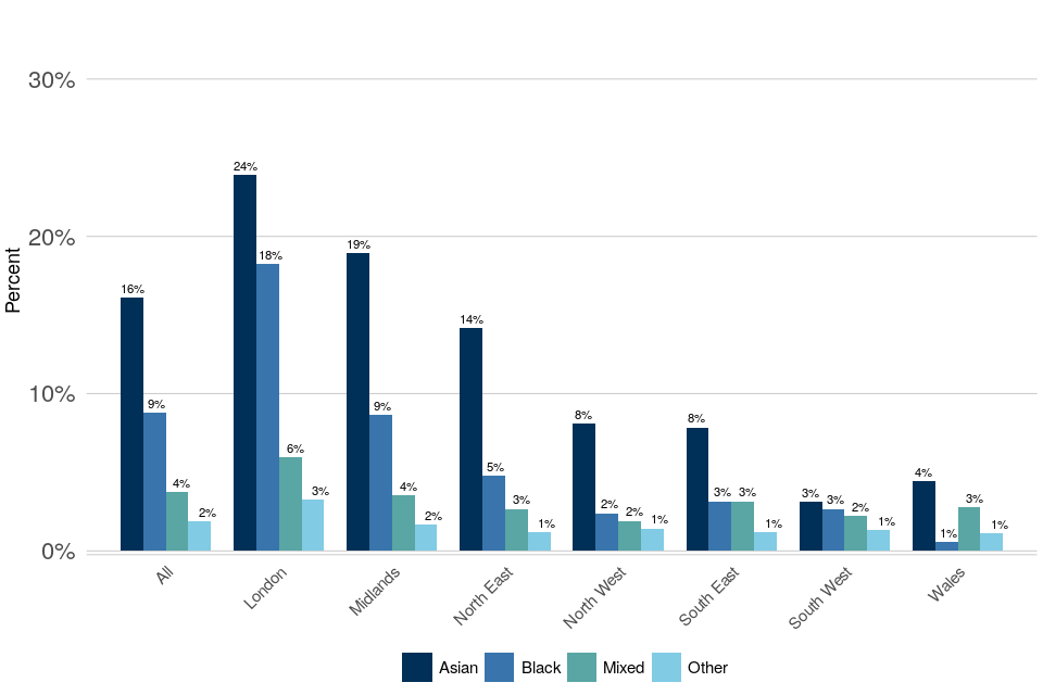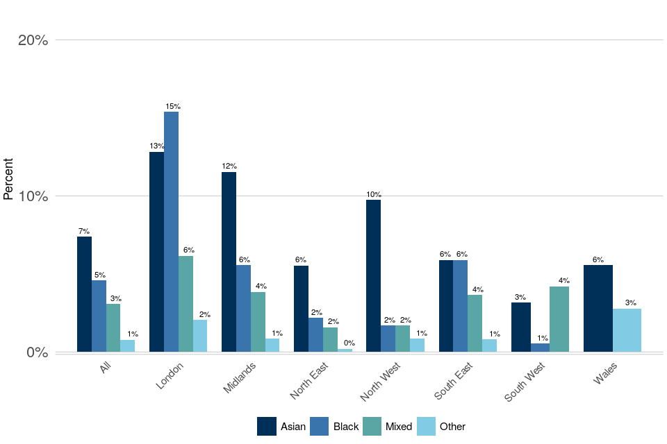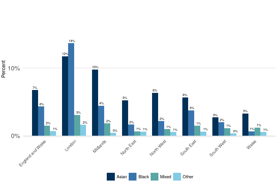 These proportions showed some variation at a regional level, where London had at least double the proportion of Asian individuals compared to all but one of the regions, and at least treble the proportion of black individuals compared to all other regions (Figure 47).
