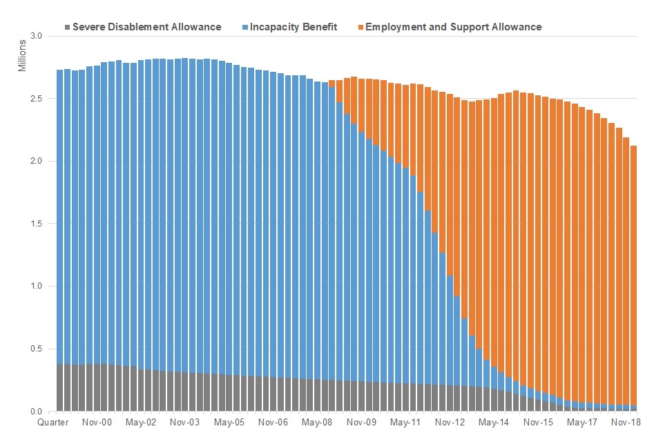 Figure 3: The number of people claiming either Incapacity Benefit, Severe Disablement Allowance or Employment and Support Allowance to February 2019