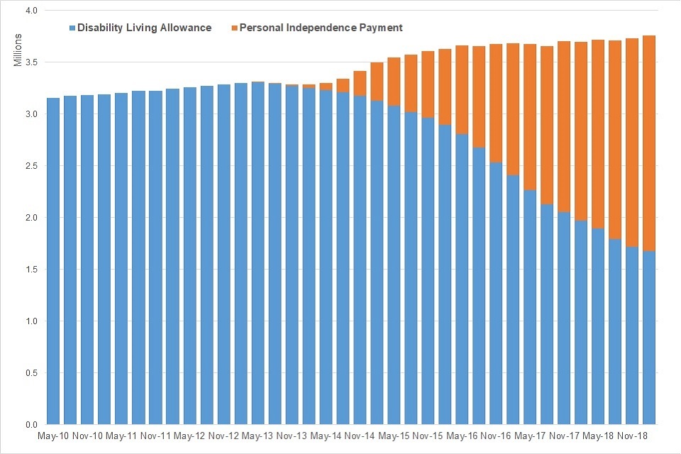 There were 2.1 million people claiming PIP at February 2019, and 1.7 million people claiming DLA. The number of people claiming PIP rose by 350,000 during the past year, and over the same period, DLA claims fell by 290,000. There were 3.8 million combined claimants at February 2019, an increase of 65,000.