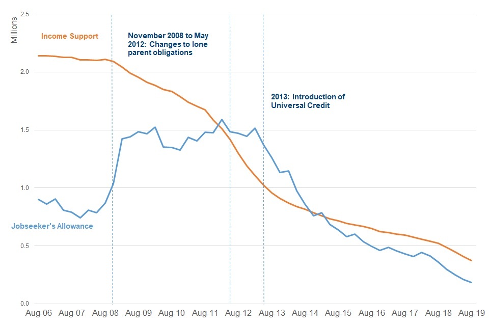 Figure 8: The number of people claiming Income Support and Jobseeker’s Allowance to August 2019