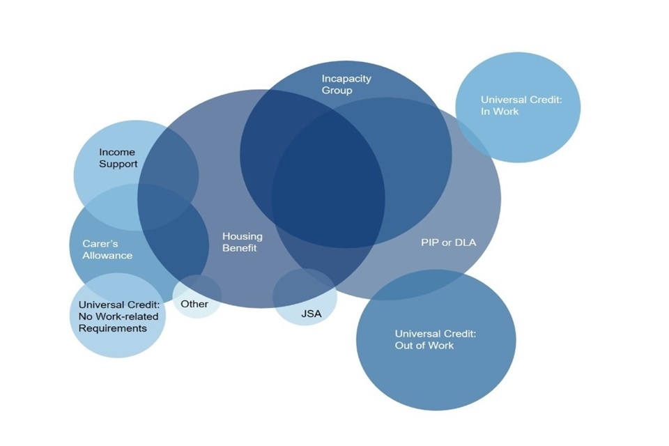 Diagram uses circles with different areas to show the relative size of DWP working age benefits by number of claimants. Circles intersect to show how some benefits are claimed in combination