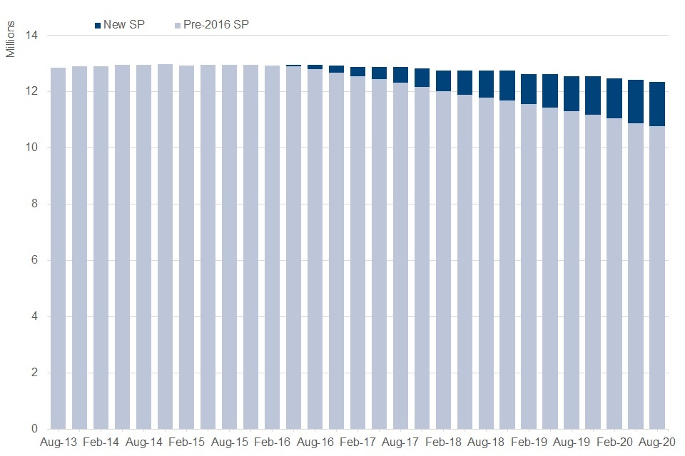 The new State Pension (nSP) scheme was introduced for people reaching State Pension Age from 6 April 2016. At August 2020 there were 1.6 million people receiving nSP, an increase of 340,000 on a year earlier.