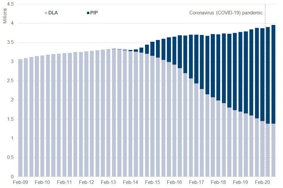 At August 2020, there were 2.6 million people claiming PIP, and 1.4 million people claiming DLA. The number of people claiming PIP rose by 330,000 while DLA claims fell by 210,000 in the year to August 2020. Transfers from DLA to PIP were affected by the coronavirus (COVID-19) pandemic – see the background note for more details.