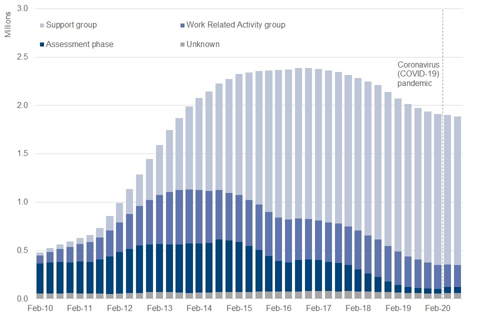 The Work Capability Assessment process for ESA has been affected by the coronavirus (COVID-19) pandemic. For more information see the most recent ESA Work Capability Assessment statistics.