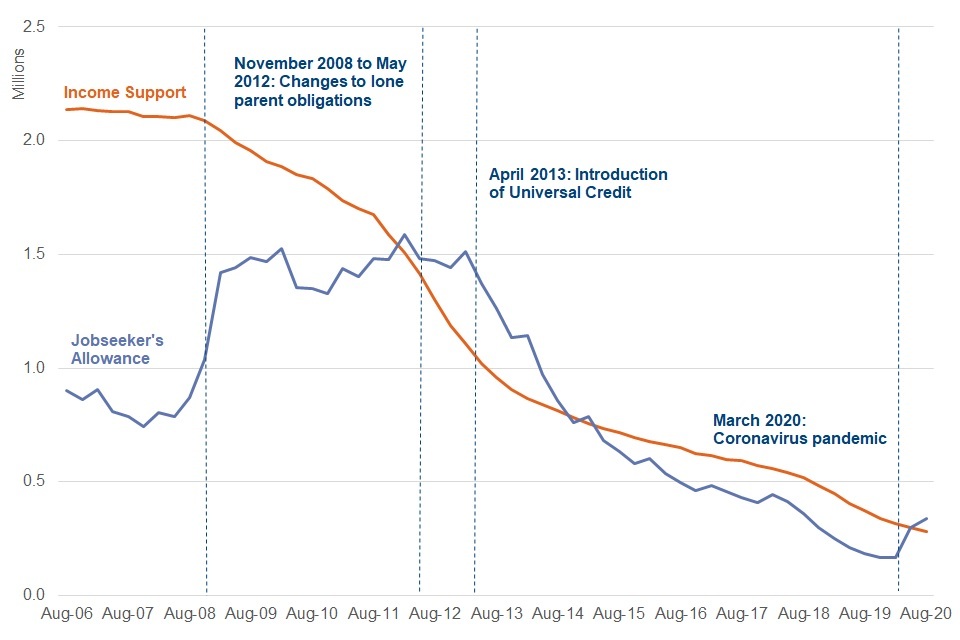 - Income Support fell to 280,000 claimants in the year to August 2020