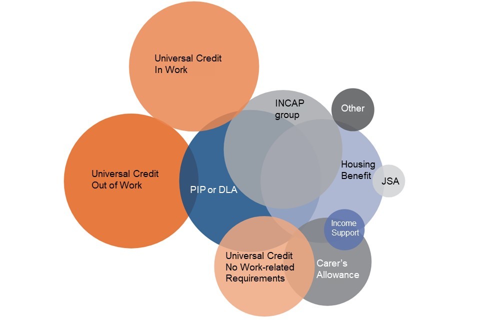 Note: This illustration uses overlapping circles, where larger circles and overlaps show more people claiming a particular combination of benefits. It is included to demonstrate the complexity of the situation for many claimants. Only the most common combinations are shown and other combinations do occur. It is not always possible for the areas to be exactly proportional to the number of cases for each combination.