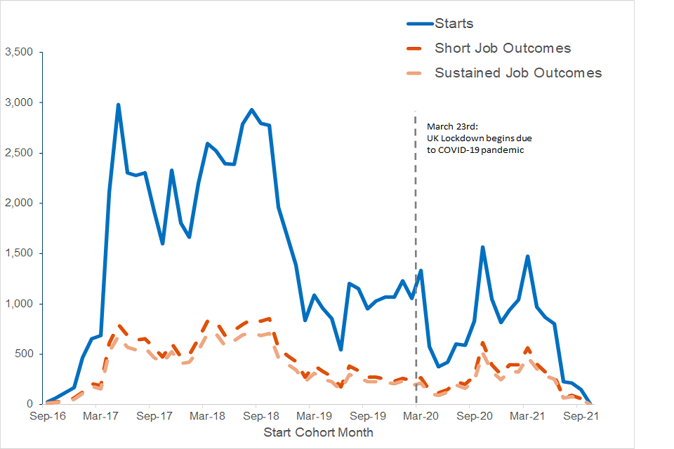 The proportion of job outcomes achieved by those that started in September 2016 is larger than any other cohort, but the number of starts at the beginning of the programme was substantially lower (Only 30 starts in September 2016) than the following months (average of over 1400 starts per month from April 2017 to October 2021). Similarly, volumes are also small in the final few months, averaging 150 starts per month in final 4 months of starts to October 2021.