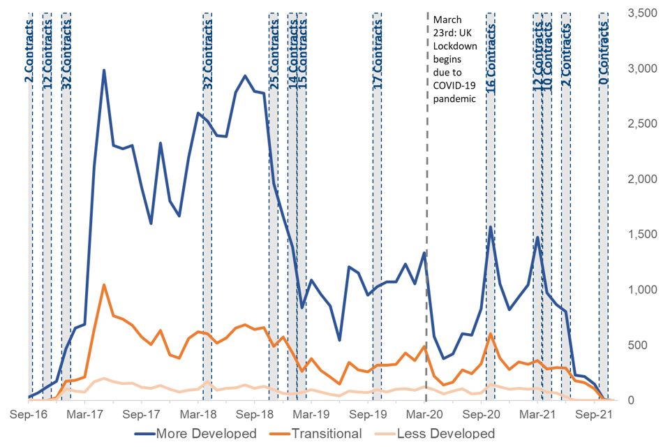 April and May then saw a reduction in starts as London contracts ended new referrals before 10 contracts finished in June 2021 with the final two contracts ending in October 2021.