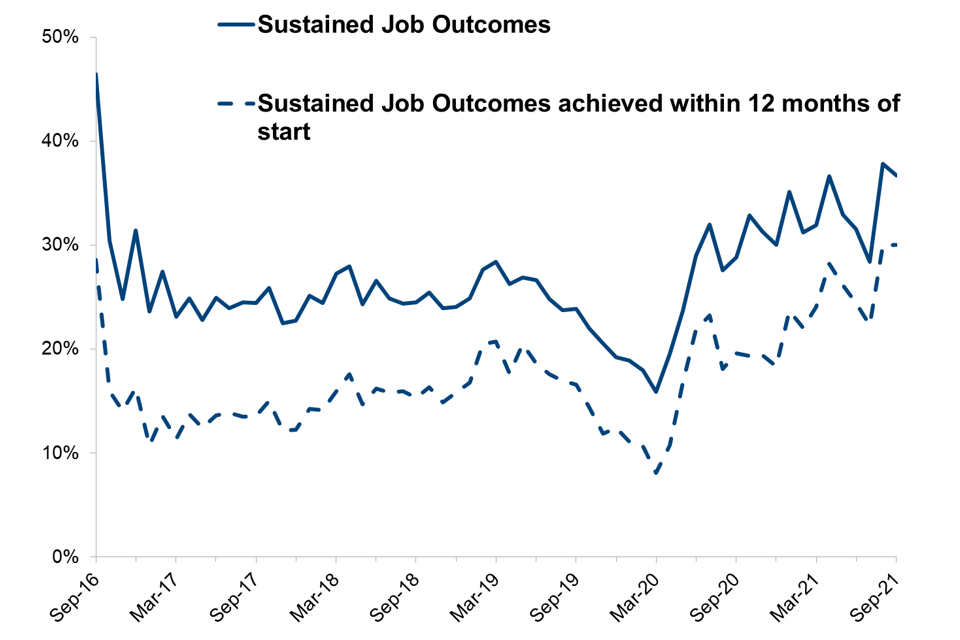 Figure 4: Percentage of starts achieving a Sustained Job Outcome by month of start, September 2016 to October 2021