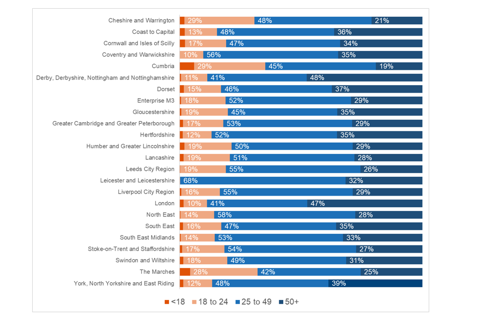 The highest proportion of 18- to 24-year-olds starting the programme (29%) is recorded in both Cheshire & Warrington and Cumbria. Leicester and Leicestershire have the highest proportion of 25- to 49-year-olds starting the programme (68%) and Derby, Derbyshire, Nottingham and Nottinghamshire had the highest proportion of those 50 years and above starting the programme (48%). The over 50-year-olds also represent 47% of starts in London, as four of the eight contracts delivered in this LEP are aimed at older workers.