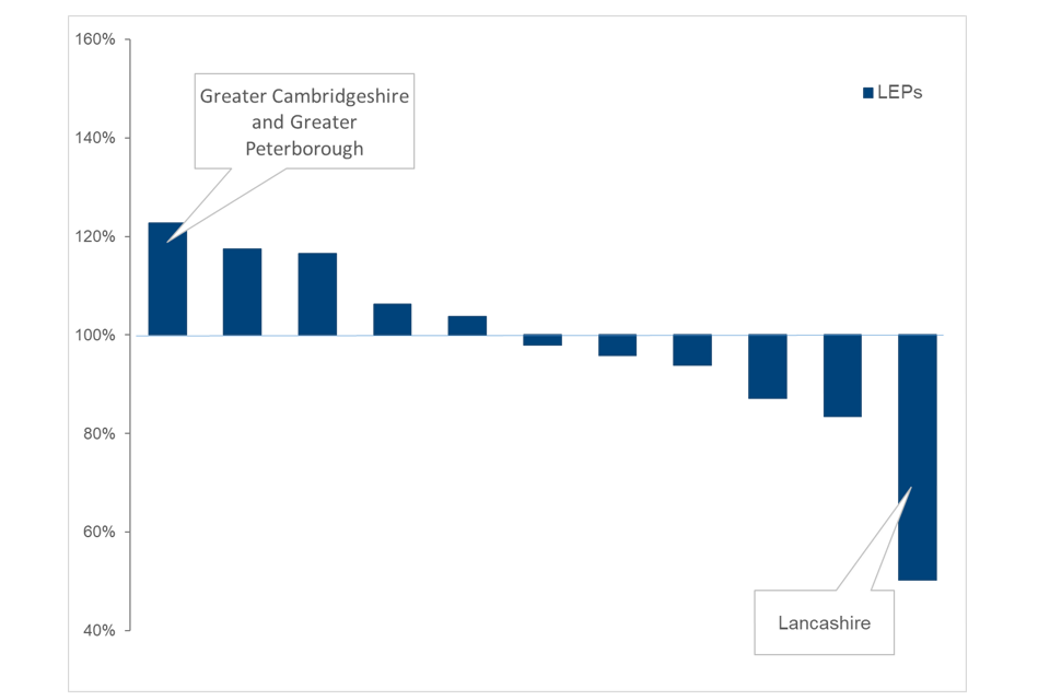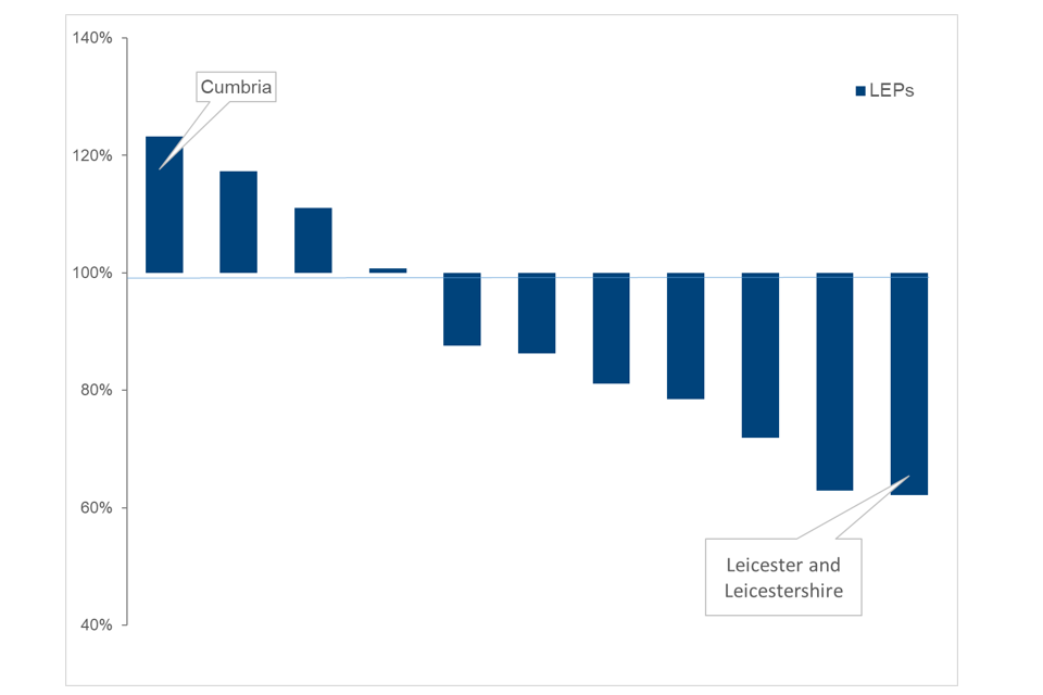 Figure 10: Short Job Outcomes as a percentage of expected performance (November 2021 to October 2022) by LEP