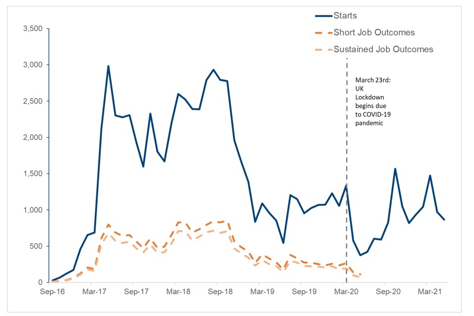 The proportion of starts achieving a Short Job Outcome has been stable since the beginning of the programme, although there was a significant reduction in the percentage of outcomes achieved, likely due to the measures taken to control the COVID-19 pandemic. This has increased in recent months though to almost pre pandemic levels.