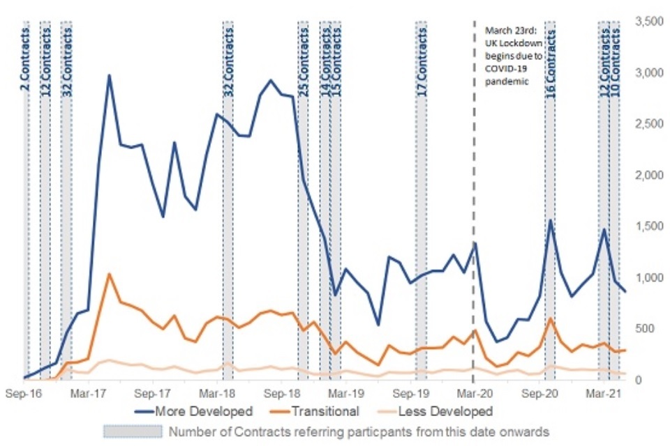 Thirty-one contracts started taking referrals in 3 phases between September 2016 and February 2017. By February 2019, 15 of the original contracts were extended and continued taking referrals. In October 2019, 2 contracts were launched in 2 LEPs previously not part of DWP CFO ESF 2014 to 2020. These changes are clearly reflected in the number of starts per month, which rose significantly between September 2016 and March 2017 (32 contracts live) and decreased from November 2018.