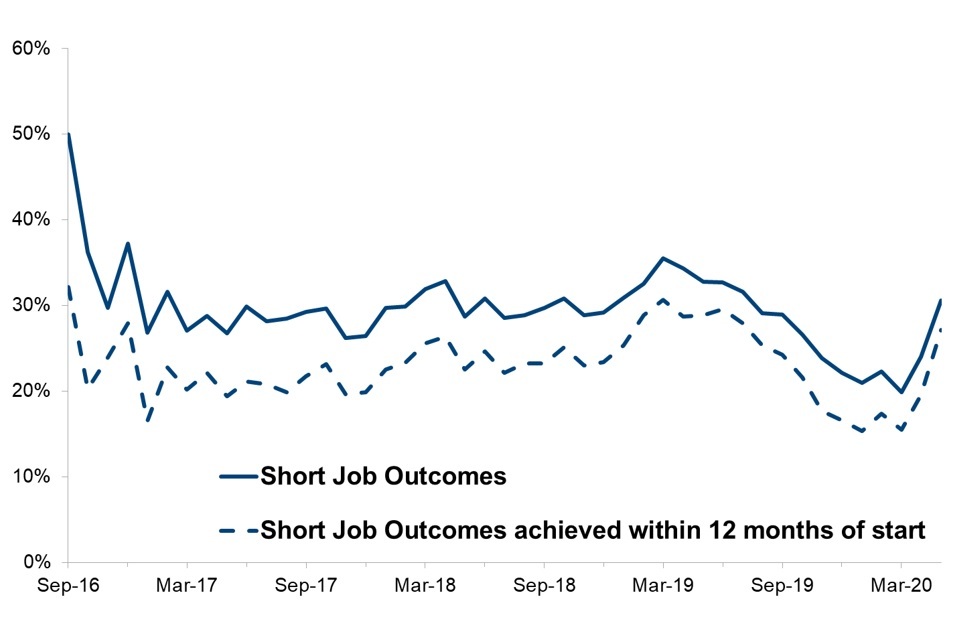 Percentage of starts achieving a Short Job Outcome by month of start, September 2016 to May 2020