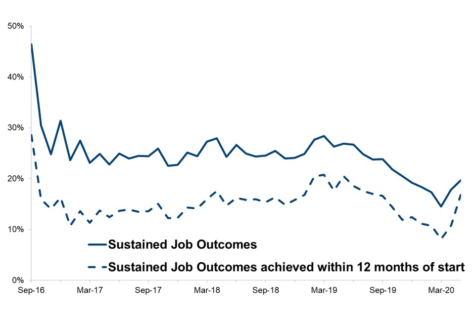Percentage of starts achieving a Sustained Job Outcome by month of start, September 2016 to May 2020