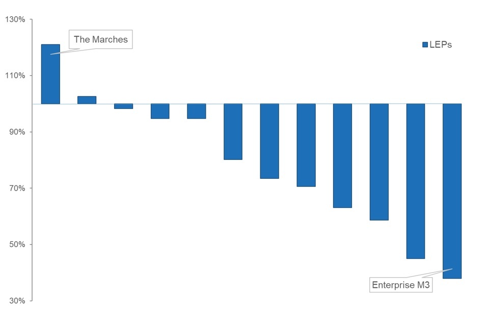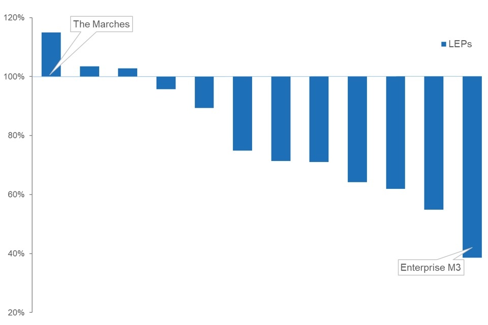 Short Job Outcomes as a percentage of expected performance (December 2019 to May2021) by LEP