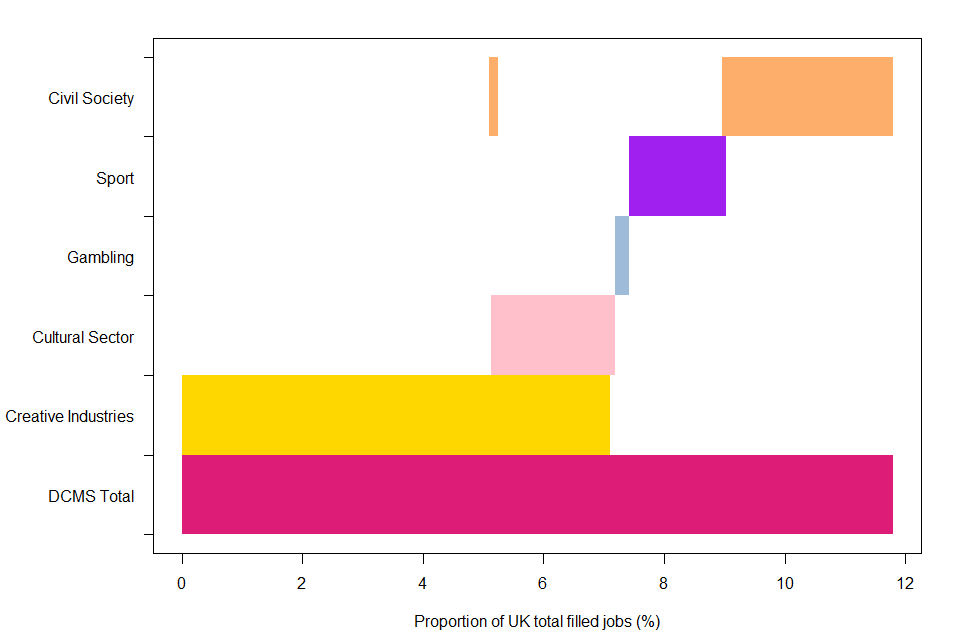 There is significant overlap between DCMS sectors therefore users should be aware that employment in the DCMS total is lower than the sum of the individual sectors.