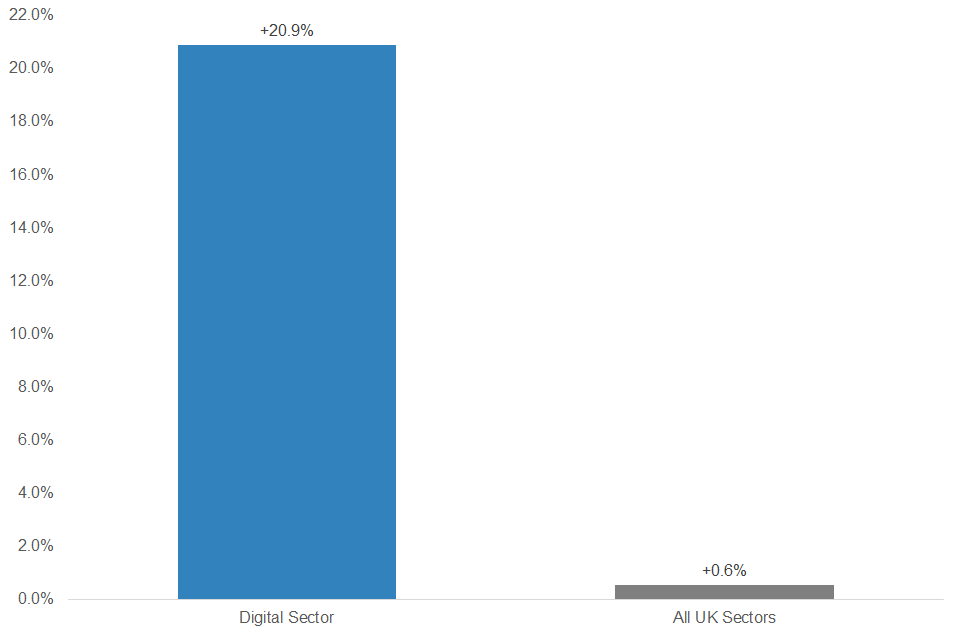 Compared to 2019 (pre-pandemic), employment in the Digital Sector has increased by 20.9%, and in the UK overall by 0.6%. Meanwhile, compared to 2021, employment in the Digital Sector increased by 4.1%, and in the UK overall by 1.5%.