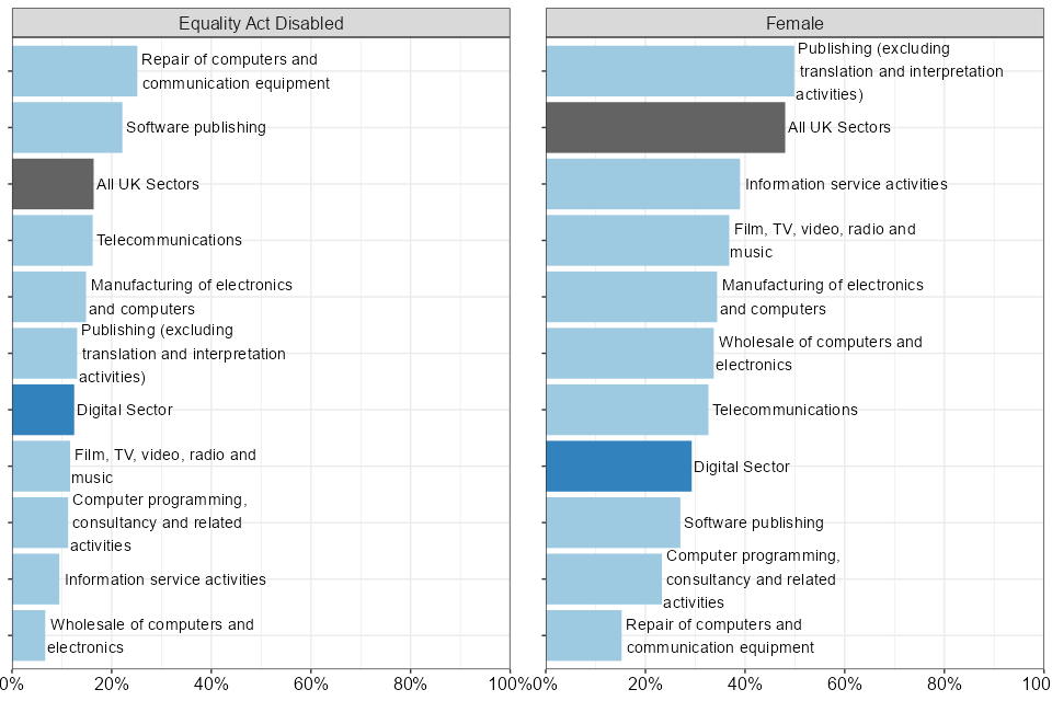 As of the 2022 calendar year, within the Digital Sector there were 29.3% (vs 48.1% UK workforce overall) of filled jobs held by women and 12.5% (vs 16.4% UK workforce overall) held by disabled people.