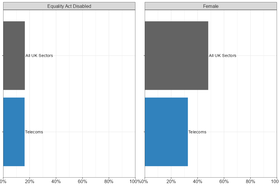 According to 2022 estimates, as a proportion, within the Telecoms sector the share of filled jobs held by women or disabled people was less than the UK workforce overall.