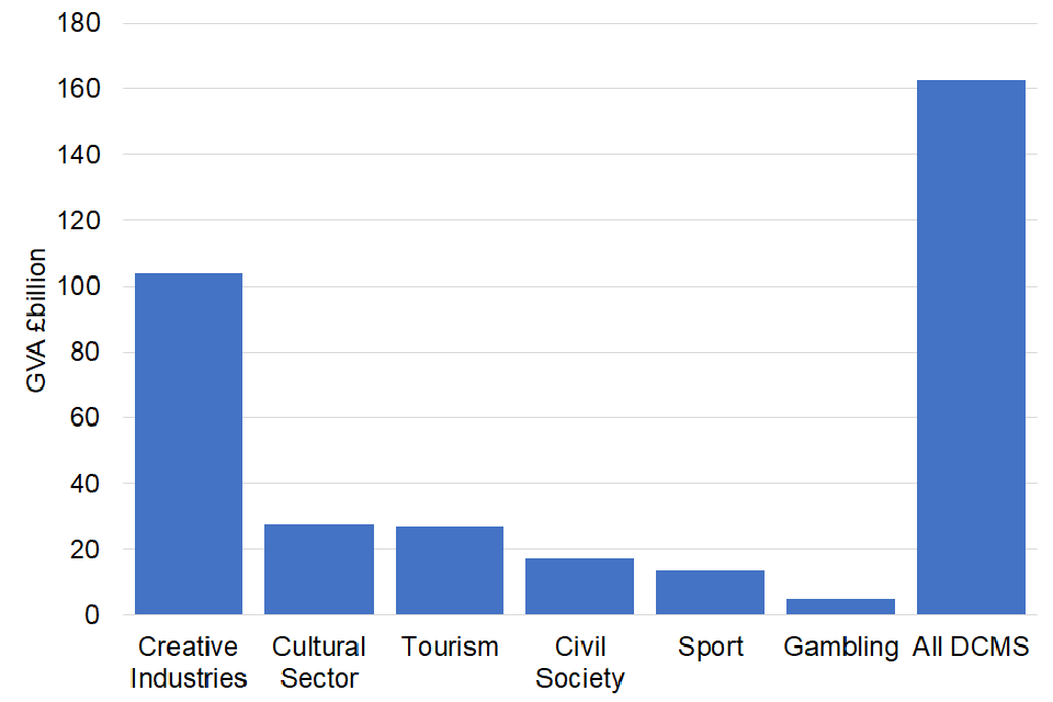 Of the DCMS Sectors, the Creative Industries Sector contributed the most in GVA to the UK economy (£103.8bn), followed by the Cultural and Tourism sectors (£27.5bn and £26.7bn respectively).