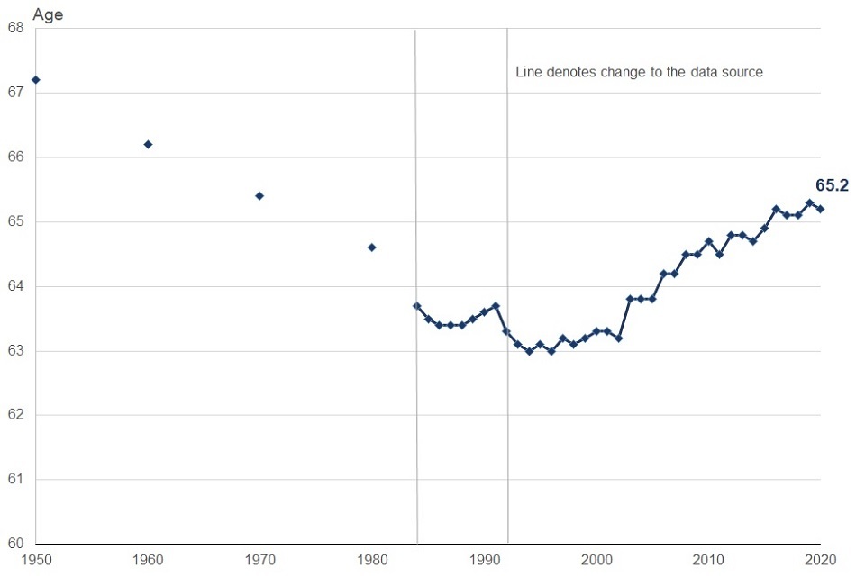 Average age of men exiting from the labour market, 1950 to 2020, UK