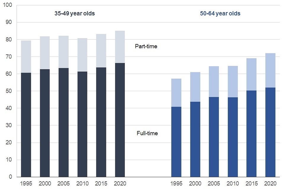 Older workers, aged 50 to 64, are more likely to be working part time than workers aged 35 to 49. Whereas, the proportion of 35 to 49 year olds working part time has remained broadly steady, the proportion of 50 to 64 year olds working part time has increased since 1995.