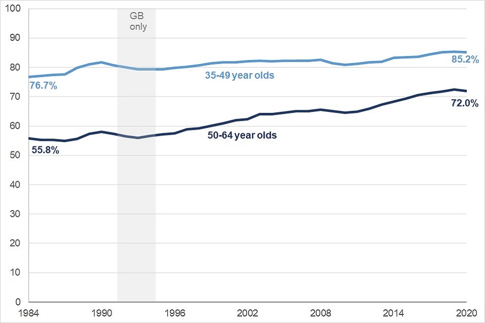 • the employment rate gap between 50 to 64 and 35 to 49 year olds is closing. In 1984 the employment rate gap between 50 to 64 and 35 to 49 years olds was 20.9 percentage points, this has gradually narrowed to 13.2 percentage points in 2020