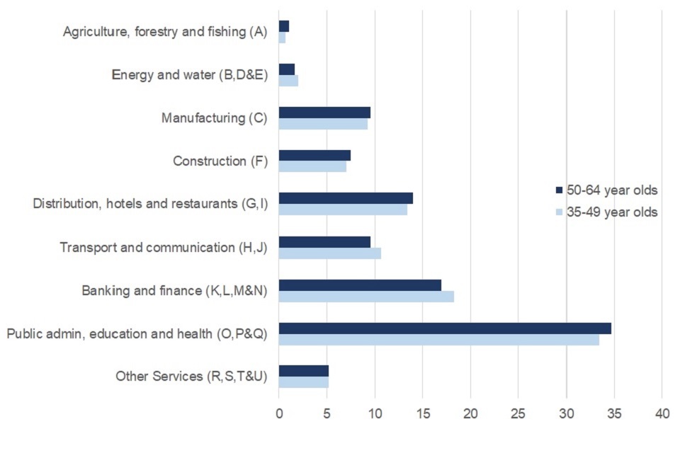 Workers aged 50 to 64 have a broadly similar distribution amongst industry sectors to those aged 35 to 49. Older workers are most prevalent in the public admin, education and health sectors with over one in three older workers employed in this sector. The same is true for the 35 to 49 age group.