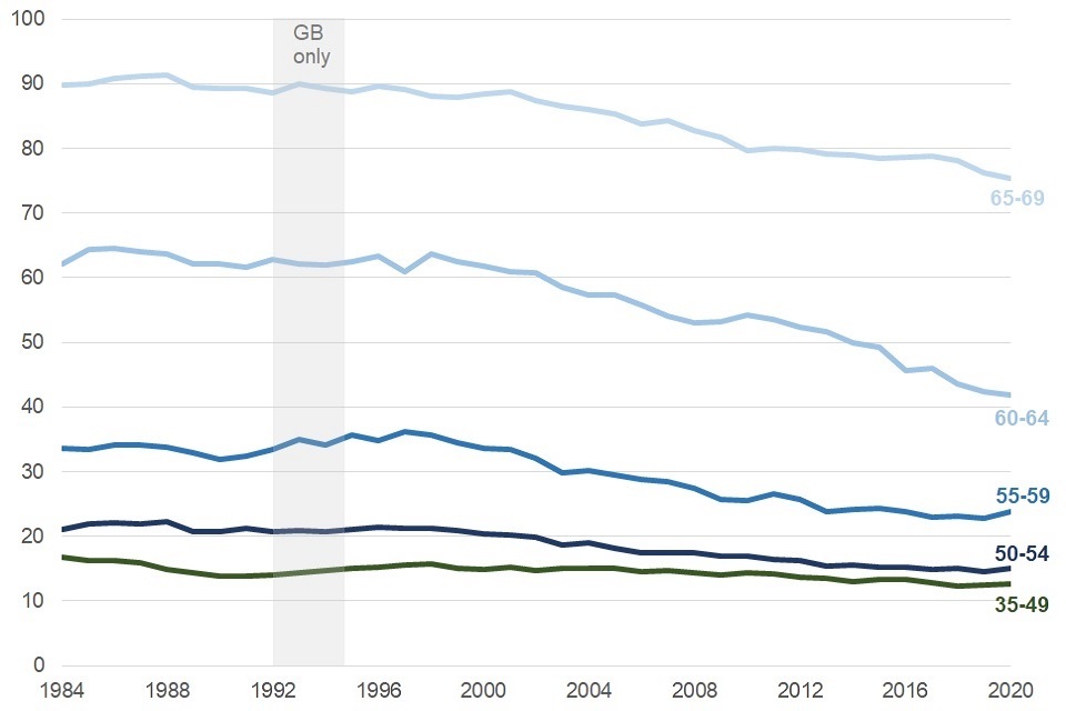 The economic activity rate for the overall 50 to 64 year old age group was 26% between April to June 2020. This rate has generally been falling steadily since 1986, when it stood at 40.3%.