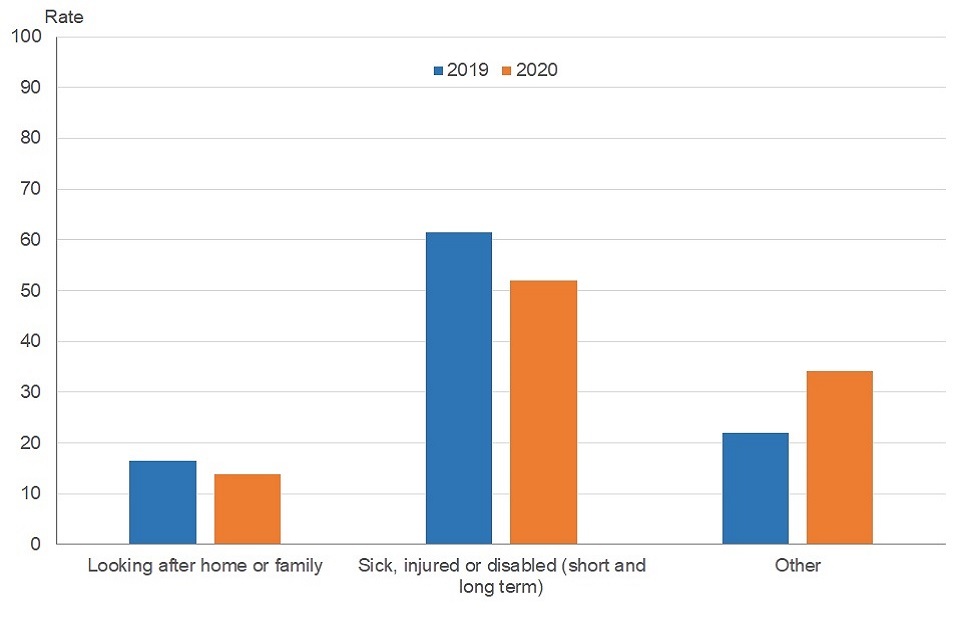 ‘Looking after home or family’ was given as a reason by 13.8%, and over a third (34.1%) gave a reason of ‘Other’ – this has increased from 22% in comparison to the same period in 2019. It is possible that the impact of the COVID-19 pandemic has driven this increase.