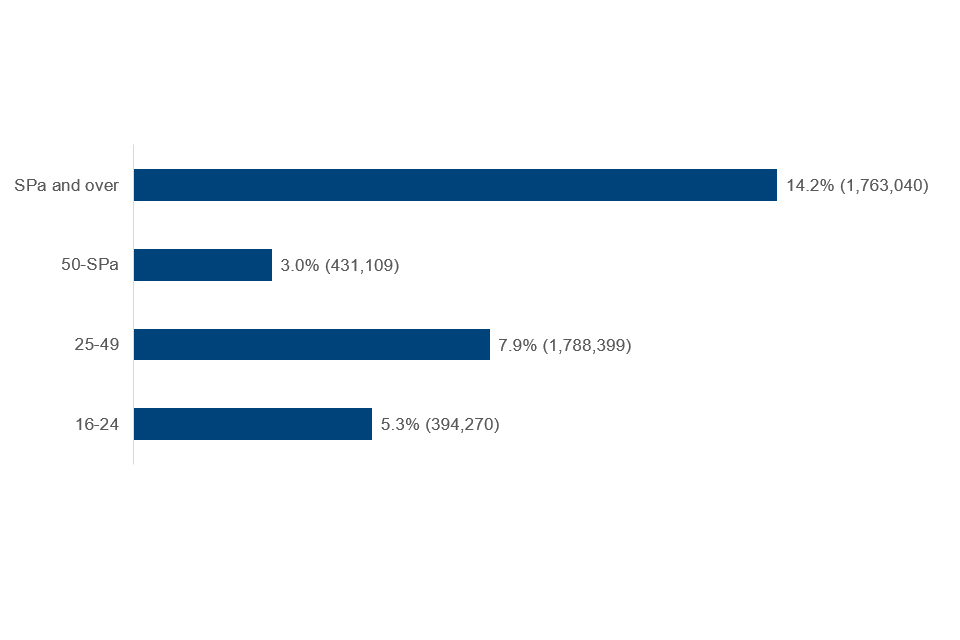 Between 2024 and 2034, it is projected that there will be approximately 0.4 million more people aged 50 to SPa (an increase of 3.0%), and 1.8 million (a 14.2% increase) more people of SPa and over. Over the same period, the 16 to 49 age population is expected to increase by 2.2 million (7.2%)[footnote 3].