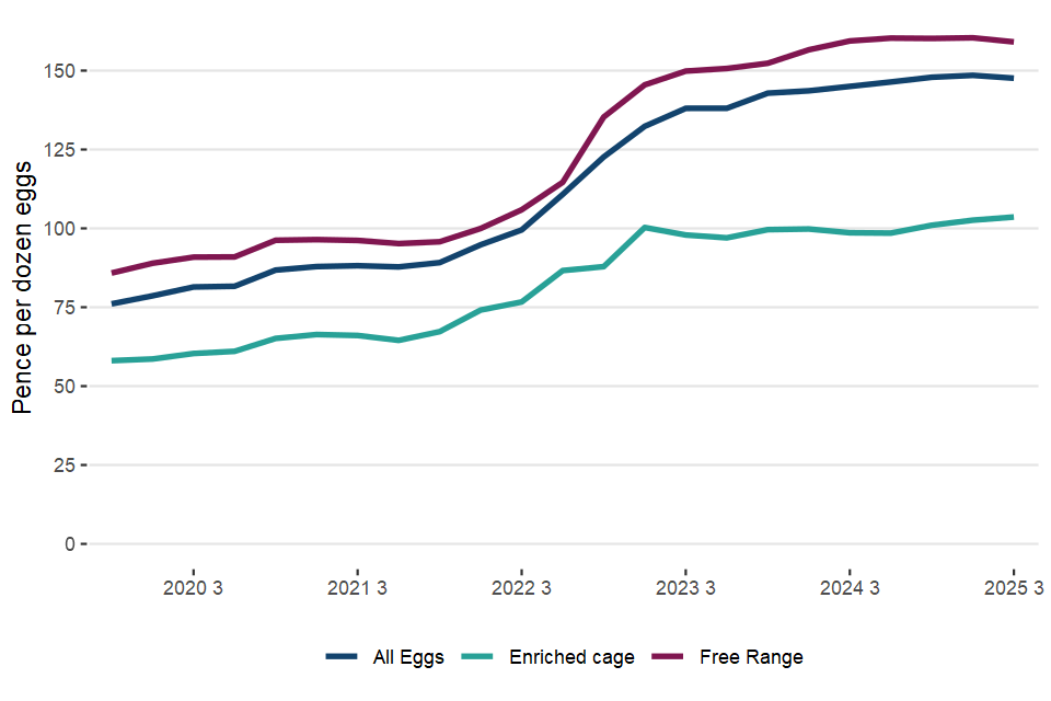 - Egg prices were an average of 148 pence per dozen in Q3 2025 which is an increase of 1.8% when compared with Q3 2024.