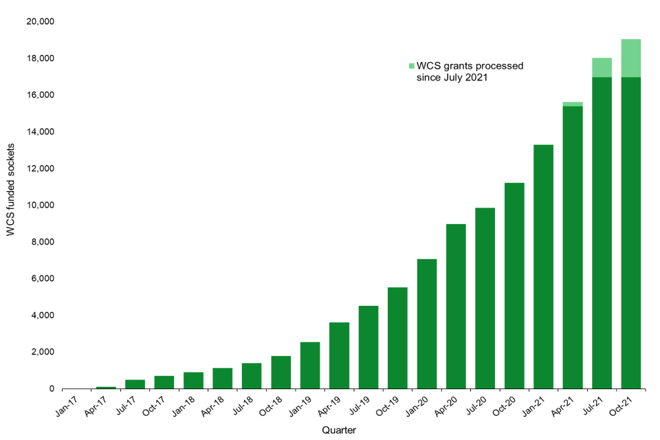 Since the scheme started in late 2016, a total of 6,958 vouchers have been redeemed accounting for 19,054 sockets installed under the WCS grant. This equated to a total grant value of £7,927,714.
