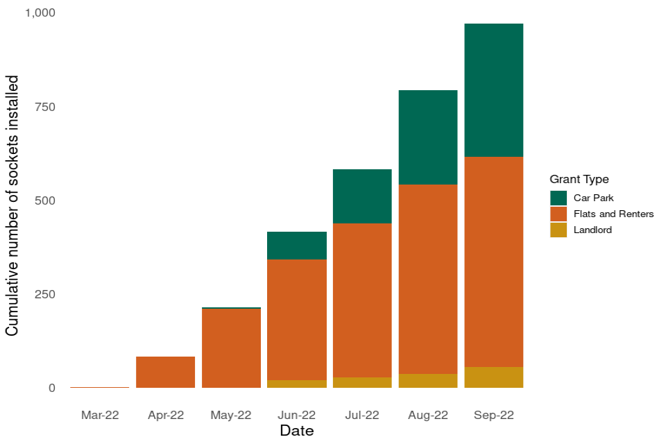 As of 1 October 2022, the scheme 972 sockets have been installed, this corresponds to £682,343 in grants. The majority of the grants which have been installed are for flats and renters with 562 sockets installed, this accounts for 58% of installations. The next largest grant type is for residential car parks with 355 socket installed accounting for 37%. The remaining 6% is for the landlords who’s grants had installed 55 sockets.