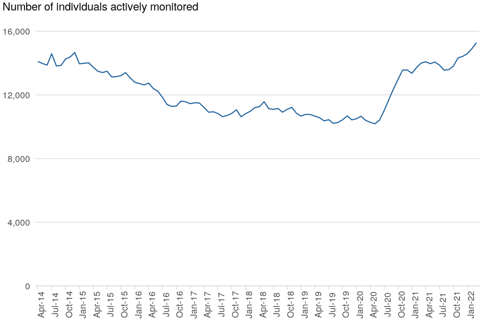 Between 31 March 2021 and 31 March 2022, the number of individuals actively monitored increased. For most of the year the numbers of individuals actively monitored remained broadly stable, at around 14,000 people. From the middle of 2021/22 however the caseload began to increase, and has now reversed the decreasing trend seen between 2015 and 2020. This increase was driven by extensions to the use of location (GPS) monitoring tags for new offender cohorts, particularly it use for immigration bail, as well as the roll-out of alcohol monitoring tags.