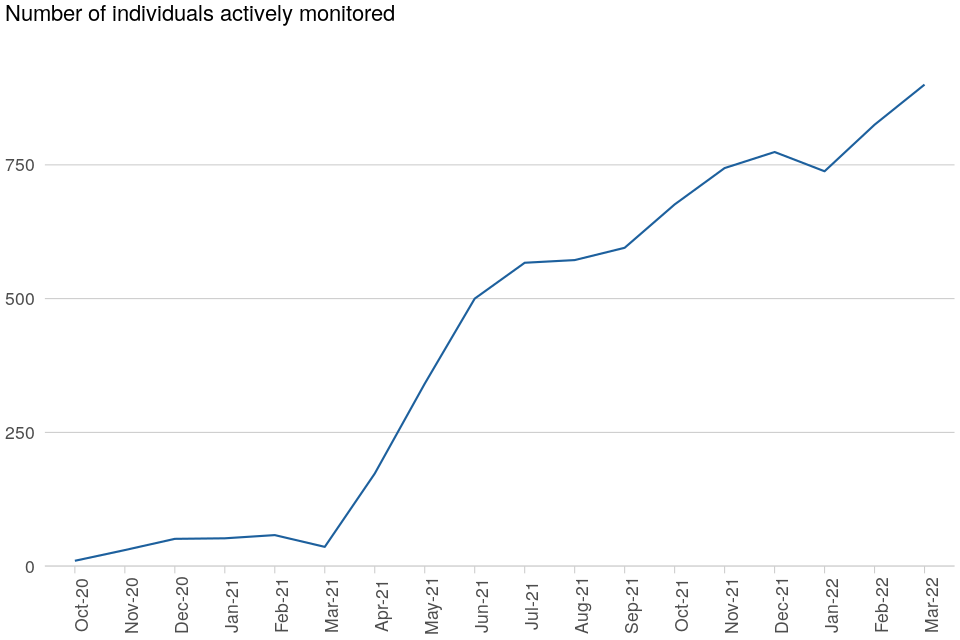 | The number of individuals being actively monitored increased by 9% | At 31 March 2022, the total number of individuals actively monitored was 15,282, an increase from 13,996 as at 31 March 2021. |