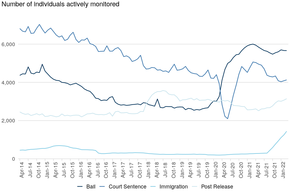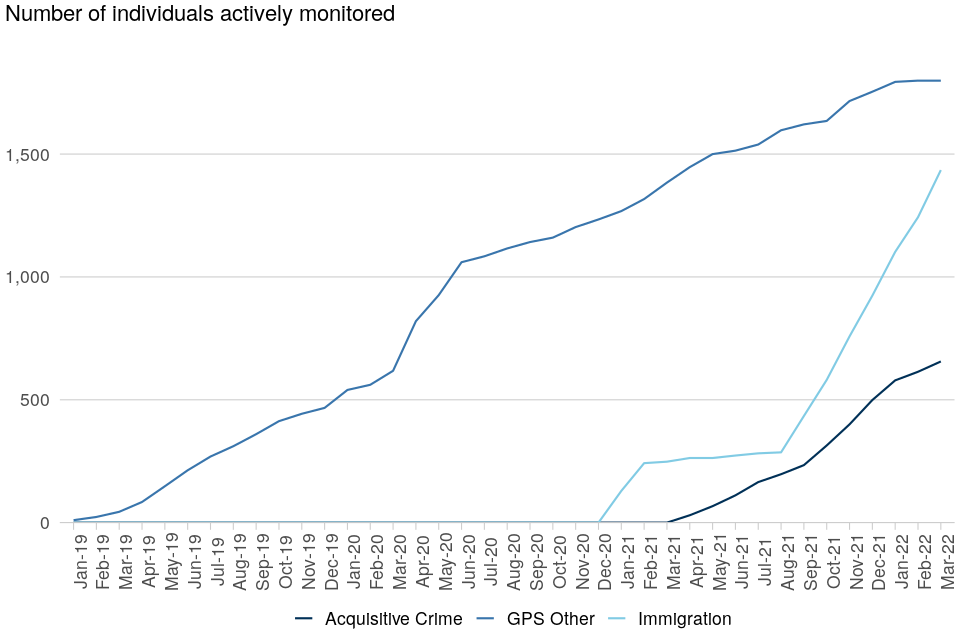 | The number of individuals being actively monitored with a location monitoring device (GPS) has more than doubled | Between 31 March 2021 and 31 March 2022 the number of individuals actively monitored with a location monitoring device (GPS) increased by 138% (from 1,632 to 3,890). This increase is the result of expanding the use of electronic monitoring to new offender cohorts, particularly immigration bail. |