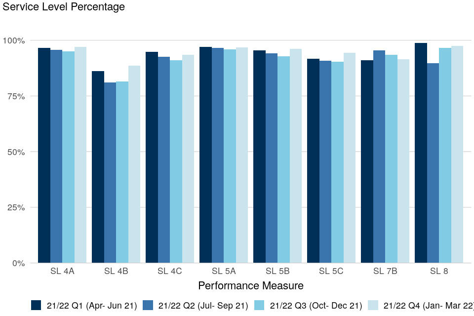 EMS Performance was largely unchanged against each quarter. EMS performance was the highest in the final quarter of 2021-22, with seven out of eight measures rising relative to the previous quarter. Five out of the eight measures met their performance target. The poorest performing measure is SL 4C which is 2 percentage points below the target of 95% with 93% in the 2021/22 performance year to date.