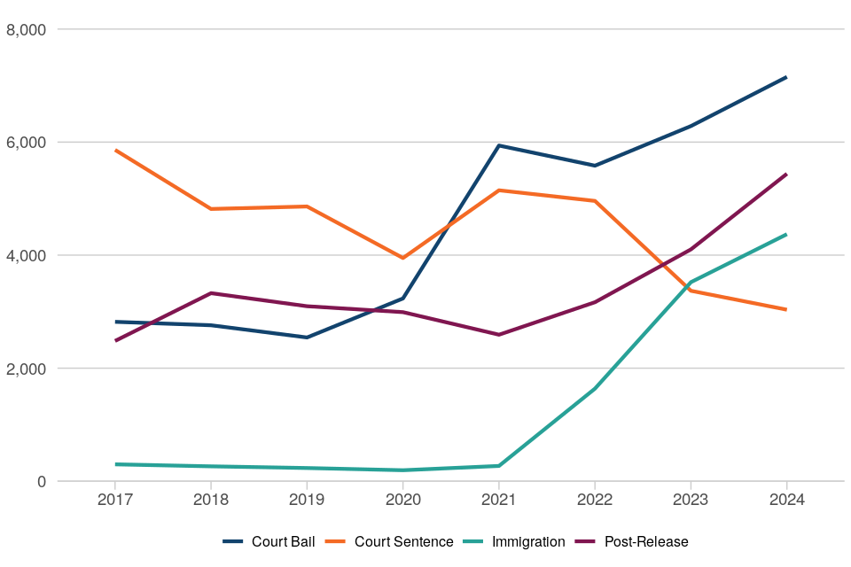 Court bail orders remain the largest cohort of individuals fitted with an electronic monitoring device, accounting for 36% (7,154) of the 31 March 2024 caseload. The use of electronic monitoring for those on court bail increased sharply in 2020 in response to the covid pandemic’s impact on the courts. Although numbers declined a little, from 2022 the numbers again increased and are now at record levels.