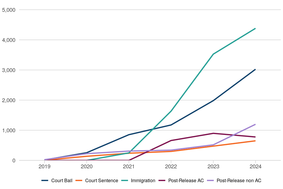 Immigration expansion: The Immigration Act 2016 introduced a duty on the Home Office Secretary of State to impose an electronic monitoring condition on Foreign National Offenders (FNOs) and other non-UK citizens subject to deportation proceedings. Following this, in August 2021, HMPPS began using GPS monitoring for those individuals who had been released from Prisons or Immigration Detention under ‘Immigration Bail’ on behalf of the Home Office. This was extended to Scotland from 31 August 2022, and to Northern Ireland from December 2022. The Home Office also commenced a pilot in June 2022 to impose an electronic monitoring condition of immigration bail to non-FNO asylum claimants who arrive in the UK via unnecessary and dangerous routes. This pilot concluded in December 2023.