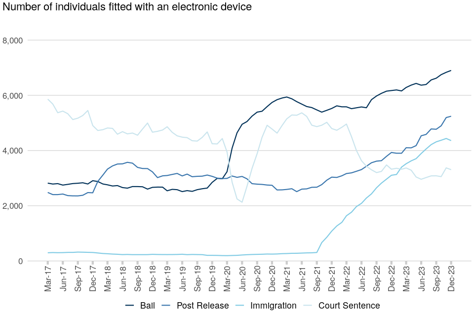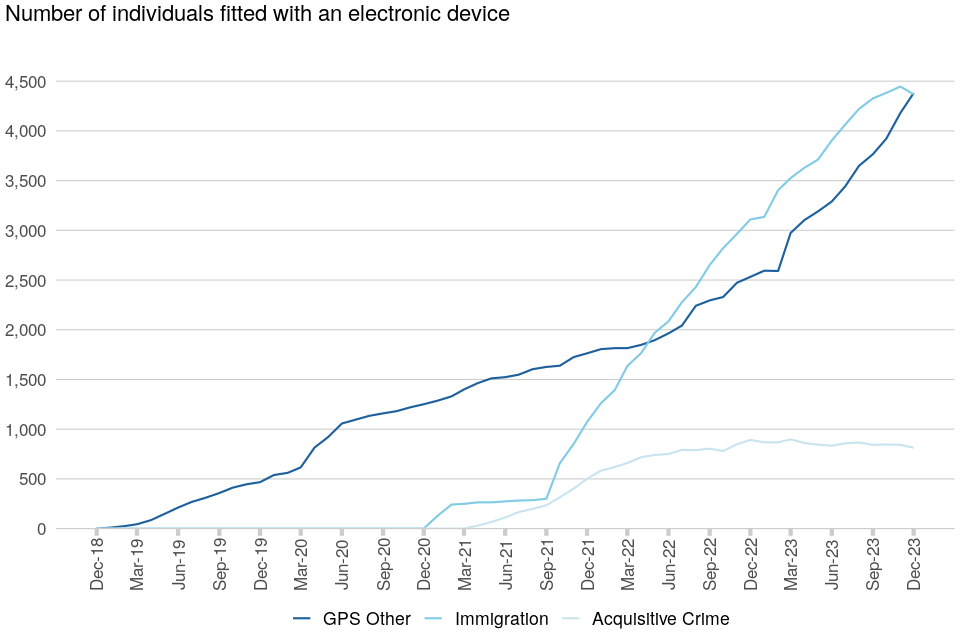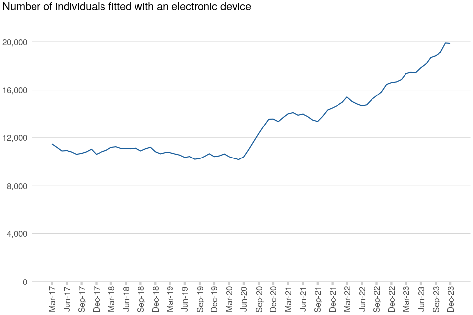 Between 31 December 2022 and 31 December 2023 the total number of individuals fitted with an electronic monitoring device (a radio frequency, location monitoring device or alcohol monitoring device) increased from 16,602 people to 19,878, an increase of 20%.