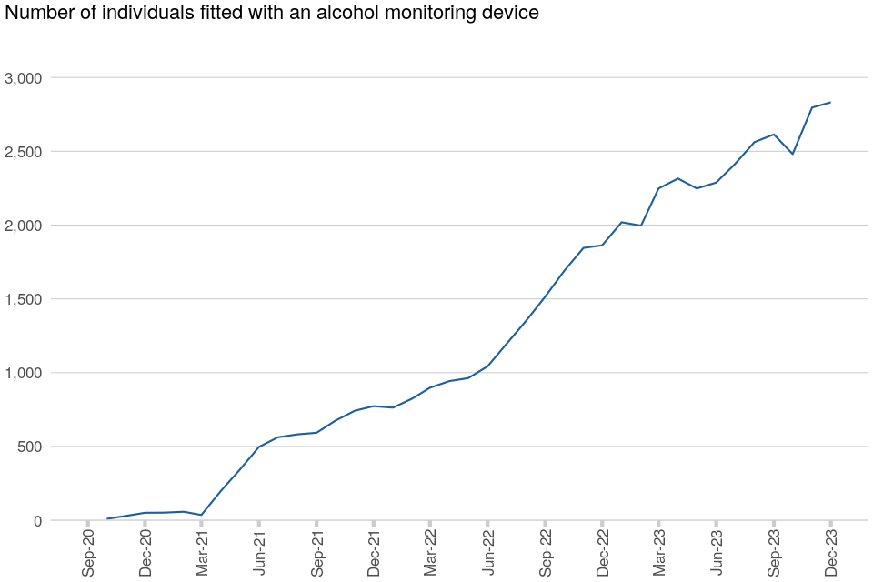 Between 31 December 2022 and 31 December 2023 the total number of individuals fitted with an alcohol monitoring device increased from 1,863 individuals to 2,832, an increase of 52%.