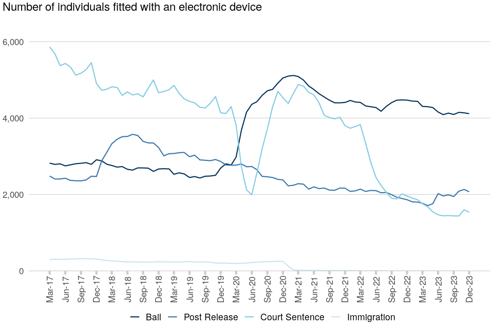 | Court bail orders remains the largest cohort of individuals fitted with an electronic monitoring device | The number of individuals fitted with an electronic monitoring device under a court bail order as at 31 December 2023 was 6,901, an increase of 12% from 6,173 as at 31 December 2022. Court bail accounted for 35% of all individuals fitted with an electronic monitoring device. |