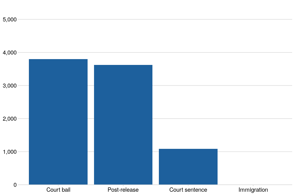 - Court bail orders make up the largest proportion (45%) of curfew (RF) monitored individuals. At 31 December 2025, 3,799 individuals had curfew court bail monitoring as their primary order type, an increase of 4% since 30 September 2025.