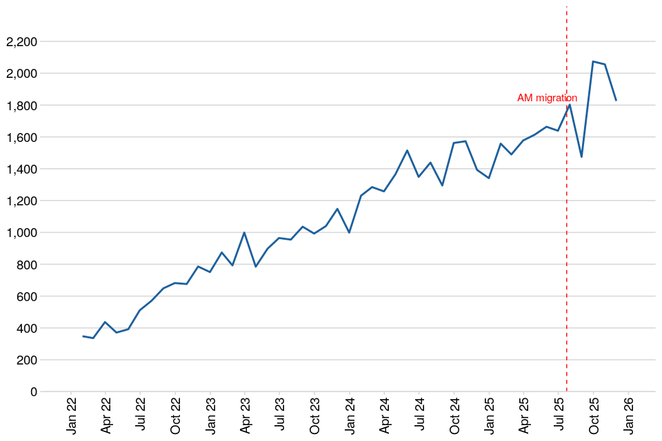 Migration of AM order data from Capita to Serco began at the end of July 2025. As with RF and GPS monitoring, the definition and methodology for reporting AM caseload statistics have been updated to align with the revised definition used across all electronic monitoring caseloads (as mentioned earlier). The number of new and completed AM orders is not impacted by the change of definition.